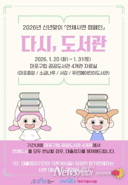 뉴스펀치 박상훈 기자 | 마포구는 2026년 새해를 맞아 도서 연체로 도서관 이용이 제한된 구민이 다시 도서관을 이용할 수 있도록 돕고, 일상 속 독서 참여를 확대하기 위해 연체사면 캠페인 '다시, 도서관'을 운영한다.