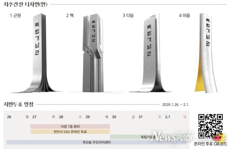 뉴스펀치 이현승 기자 | 천안시가 독립기념관 진입로에 설치될 새로운 지주간판 디자인 선정을 위해 2월 1일까지 시민투표를 진행한다고 27일 밝혔다.