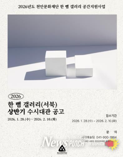 뉴스펀치 이현승 기자 | (재)천안문화재단은 오는 28일부터 상반기 한 뼘 갤러리 수시대관 공모 접수를 받는다고 27일 밝혔다.