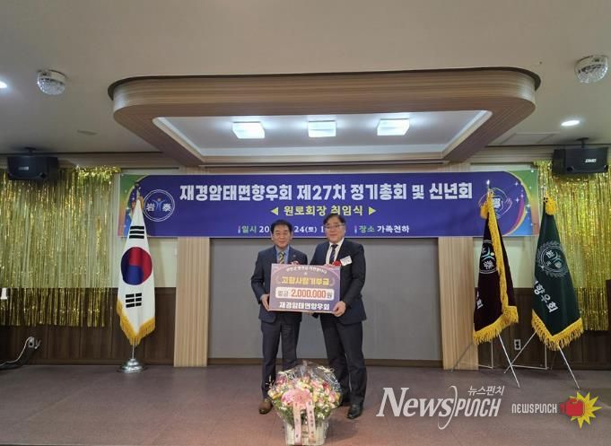 뉴스펀치 김용희 기자 | 재경암태면향우회는 지난 1월 24일 개최된 2026년도 향우회 정기총회 및 신년회 행사장에서 고향사랑기부금 200만 원을 암태면에 전달했다.