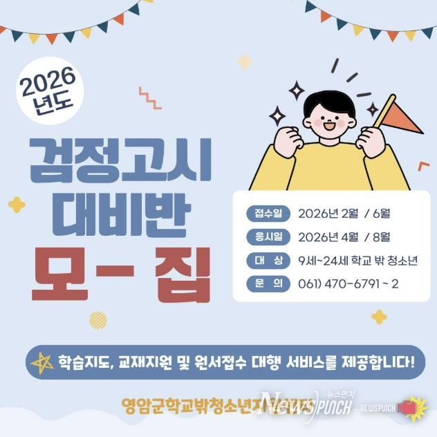 뉴스펀치 김용희 기자 | 영암군학교밖청소년지원센터가 2월부터 운영하는 검정고시 대비반 참여 청소년을 상시 모집한다.