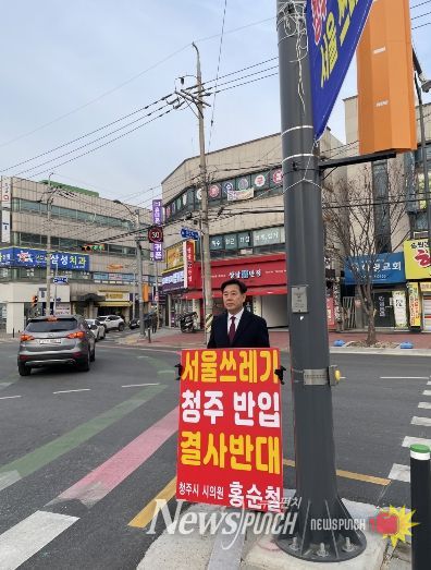 뉴스펀치 이현승 기자 | 청주시의회 홍순철의원(국민의힘, 복대2동·가경동)이 26일 본회의에‘폐기물관리법령 개정 촉구 건의안’을 대표 발의한 이후, 도심 곳곳에서 1인 피켓 시위에 나섰다.