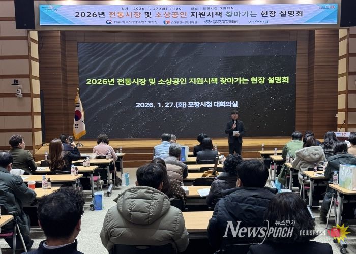 뉴스펀치 박세훈 기자 | 포항시는 27일 시청 대회의실에서 대구경북지방중소벤처기업청 주관으로 ‘2026년 전통시장·소상공인 찾아가는 현장설명회’를 개최하며 지역 상인들의 정책 접근성 강화에 나섰다.