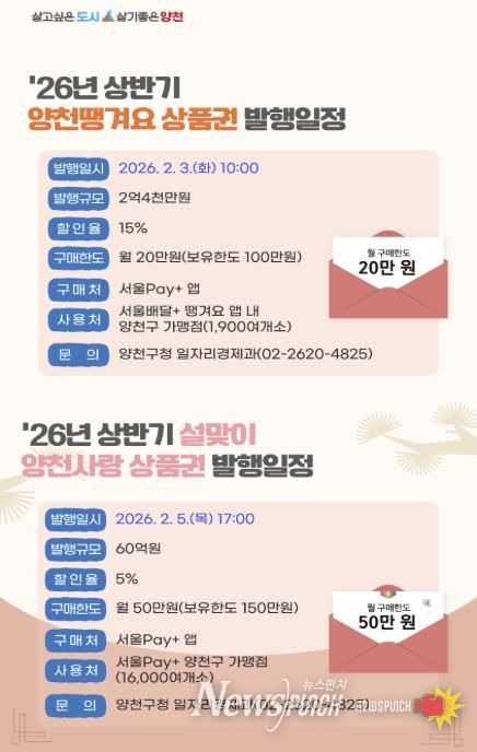 이기재 양천구청장은 “설 명절을 맞아 발행되는 이번 상품권이 지역 소상공인에게는 매출 회복의 계기가 되고, 구민들에게는 실질적인 생활비 절감으로 이어지길 바란다”며 “앞으로도 지역 상권과 구민 모두가 체감할 수 있는 민생경제 정책을 지속적으로 추진해 나가겠다”고 말했다.
