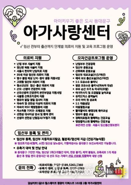 프로그램 신청·문의는 동대문구 아가사랑센터를 통해 안내받을 수 있다. 아가사랑센터는 청량리역 6번 출구 인근(서울 동대문구 답십리로1길 10, 2층)에 위치한 모자보건센터로, 임신·출산·육아 단계별 프로그램과 상담도 운영한다.