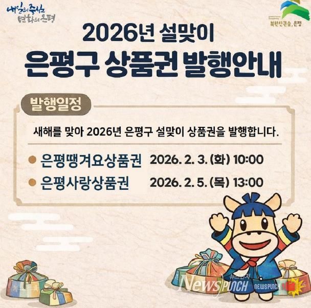 뉴스펀치 박상훈 기자 | 서울 은평구는 설 명절을 맞아 오는 2월 첫째 주에 은평땡겨요상품권과 은평사랑상품권을 발행한다고 밝혔다.