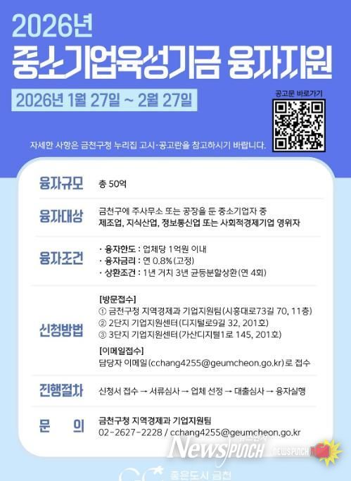 뉴스펀치 박상훈 기자 | 금천구는 자금 운용에 어려움을 겪는 지역 내 중소기업을 지원하기 위해 50억 원 규모의 ‘2026년도 중소기업육성기금 융자지원 사업’을 추진한다고 밝혔다.