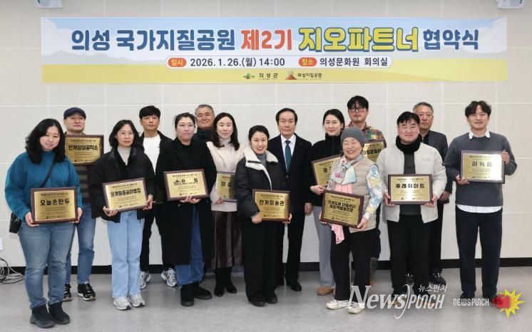 뉴스펀치 박세훈 기자 | 의성군은 지난 26일 국가지질공원의 체계적인 운영과 지역사회 기반의 지속가능한 발전을 위해 제2기 의성 국가지질공원 지오파트너 16개소를 선정하고, 협약식 및 간담회를 개최했다고 밝혔다.