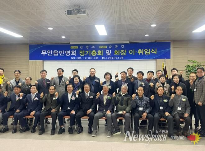 뉴스펀치 김용희 기자 | 무안군 무안읍 번영회는 지난 27일 무안읍사무소 2층 회의실에서 정기총회 및 회장 이·취임식을 개최했다.