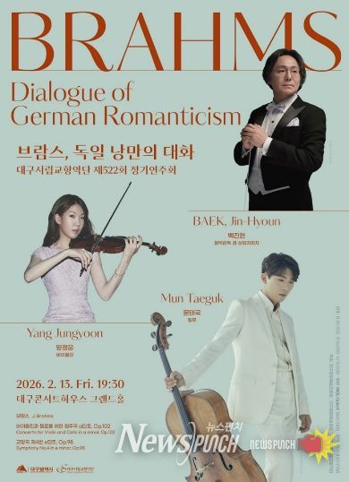 뉴스펀치 조평훈 기자 | 두 악기가 주고받는 정교한 선율에서 오케스트라가 만드는 밀도 높은 호흡까지, 대구시립교향악단은 오는 2월 13일 오후 7시 30분, 대구콘서트하우스 그랜드홀에서 '제522회 정기연주회 : 브람스, 독일 낭만의 대화'를 선보인다.