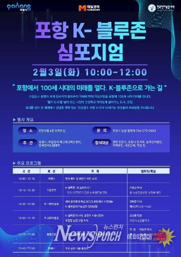뉴스펀치 박세훈 기자 | 포항시는 내달 3일부터 시청 대회의실에서 ‘포항에서 100세 시대의 미래를 열다, K-블루존으로 가는 길’ 심포지엄을 개최한다.