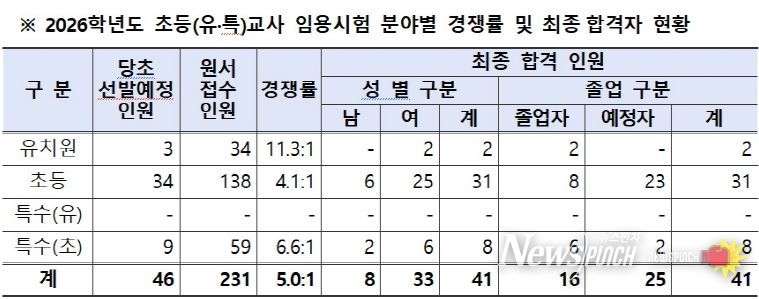 분야별 최종 합격 인원은 유치원 2명, 초등 31명, 특수(초등) 8명이다. 합격자 현황을 성별로 보면 남자 8명(19.5%), 여자 33명(80.5%)이며, 학력별로는 졸업자 16명(39%), 졸업예정자 25명(61%)으로 집계됐다.