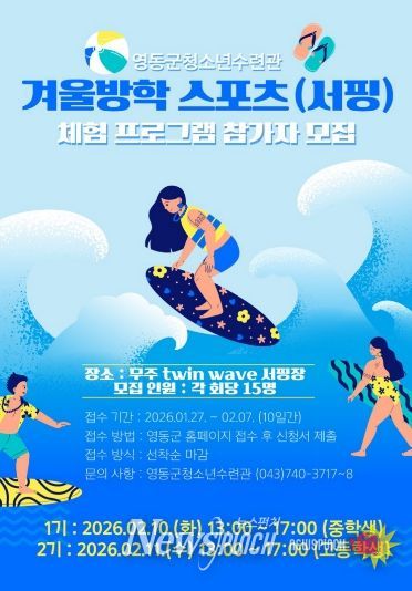 뉴스펀치 이현승 기자 | 충북 영동군은 겨울방학을 맞아 청소년들에게 다양한 체험 기회를 제공하기 위해 ‘겨울방학 스포츠(서핑) 체험 프로그램’ 참가자를 모집한다고 밝혔다.