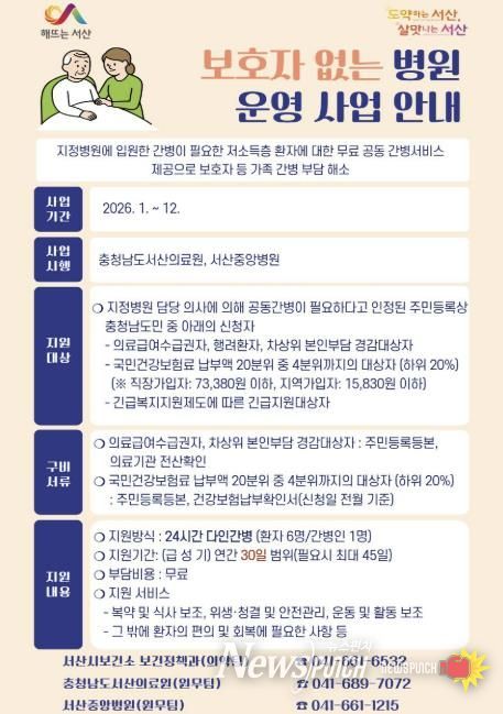 뉴스펀치 이현승 기자 | 충남 서산시가 저소득층 환자와 보호자의 간병 부담을 해소하기 위해 ‘보호자 없는 병원 사업’을 연중 운영 중이다.