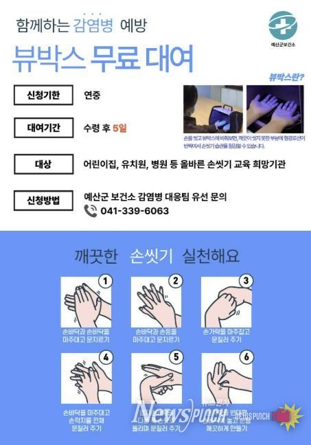 뉴스펀치 이현승 기자 | 예산군보건소는 지역 내 유치원과 어린이집, 초·중·고등학교, 병원 등을 대상으로 감염성 질환을 차단하고 올바른 손 씻기 습관 형성을 돕기 위해 ‘손 씻기 체험기기 무료 대여 사업’을 실시한다.