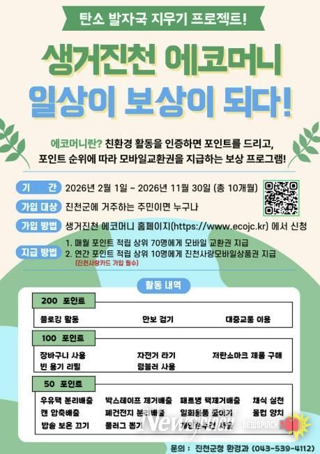 뉴스펀치 이현승 기자 | 충북 진천군은 기후 위기 대응과 탄소중립 실현을 위해 군민이 직접 참여하는 ‘2026년 생거진천 에코머니 사업’을 오는 2월부터 본격 추진한다고 29일 밝혔다.