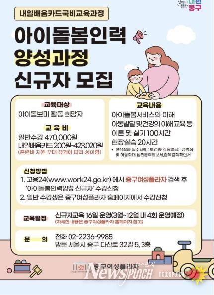 뉴스펀치 박상훈 기자 | 서울 중구가 개별 가정의 돌봄 공백을 해소하고 안정적인 취업 기회를 확대하기 위해 중구여성플라자와 함께 ‘아이돌봄인력 양성과정’을 운영한다.