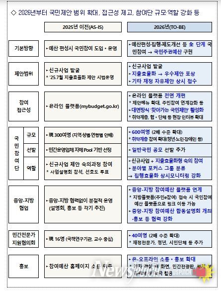 이에 기획예산처는 그 첫 발걸음으로 2018년에 도입된 국민참여 예산제도를 획기적으로 확대·개편하고 2026년을 참여예산제도 도입 제2의 원년으로 삼고자 한다.