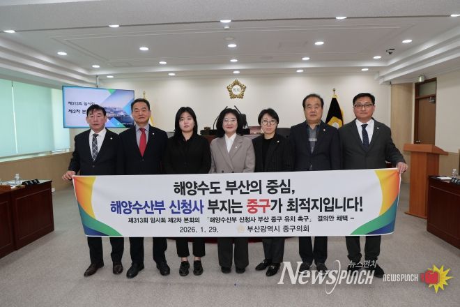 뉴스펀치 김윤걸 기자 | 부산광역시 중구의회는 1월 29일 제313회 임시회 제2차 본회의에서 '해양수산부 신청사 부산 중구 유치 촉구 결의안'을 강주희 의장 등 의원 7인 전원 만장일치로 채택했다고 밝혔다.