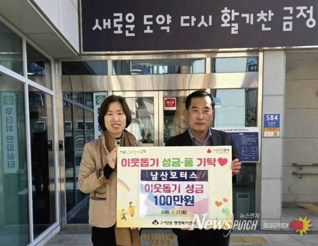 뉴스펀치 김윤걸 기자 | 부산 금정구 구서2동은 지난 27일 (주)남산모터스에서 이웃돕기성금 100만 원을 기탁했다고 밝혔다.
