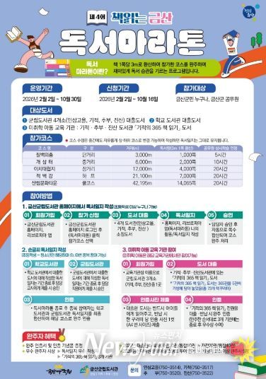 뉴스펀치 이현승 기자 | 금산군은 일상 속 군민들의 독서 습관 형성을 돕고 책 읽는 공동체 문화를 확산하기 위해 2월 2일부터 10월 30일까지 제4회 독서마라톤을 개최한다.