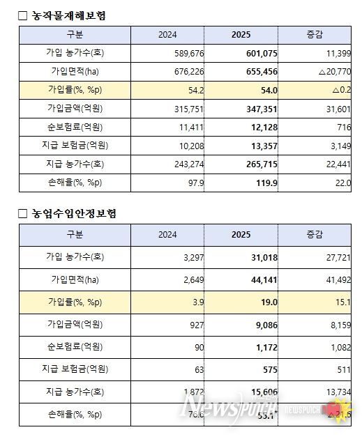농작물재해보험은 전년 대비 2개(오이, 시설깻잎) 품목을 추가한 78개, 농업수입안정보험은 전년 대비 5개 품목(사과, 배, 노지대파, 시설대파, 시설수박)을 추가한 20개에 대해 운영할 예정이다.