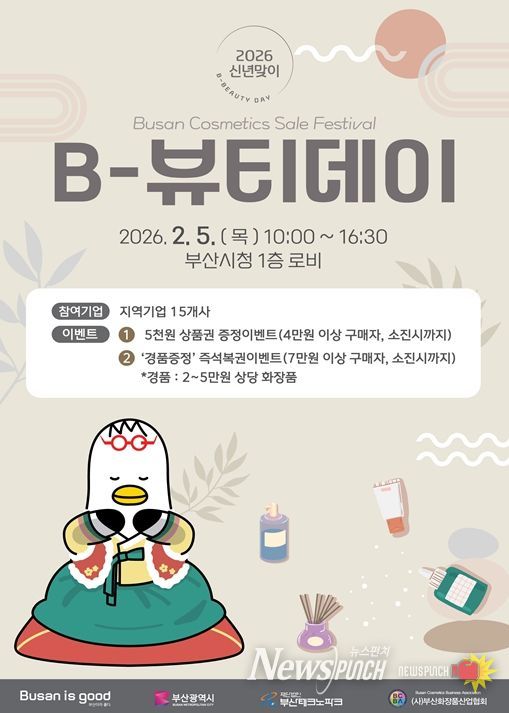 뉴스펀치 김윤걸 기자 | 부산시는 오는 2월 5일 오전 10시부터 오후 4시 30분까지 시청 1층(대강당-대회의실 앞)에서 '2026 설맞이 비(B)-뷰티 데이'를 개최한다고 오늘(2일) 밝혔다.