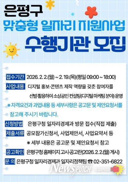 뉴스펀치 박상훈 기자 | 서울 은평구는 맞춤형 일자리 창출과 지역 소상공인의 디지털 경쟁력 강화를 위해 ‘2026년 중장년 새출발 퇴직자 등 맞춤형 일자리 지원사업’ 수행기관을 공개 모집한다고 밝혔다.