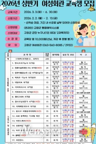 뉴스펀치 정홍균 기자 | 고창군이 군민의 건강한 여가 활동과 자기 계발을 지원하기 위해 오는 13일까지 상반기 여성회관 교육 수강생을 모집한다.