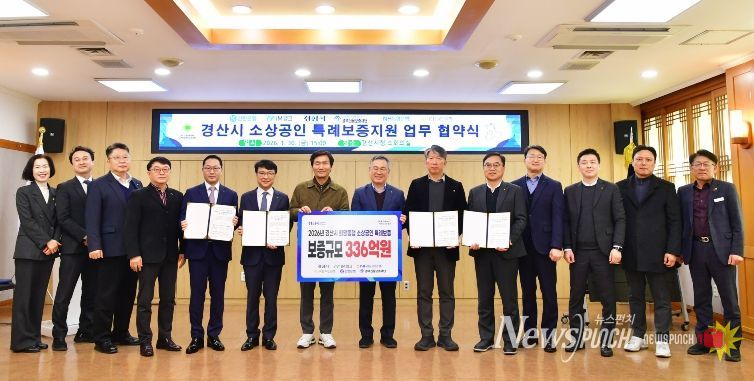 뉴스펀치 박세훈 기자 | 경산시는 30일 경북신용보증재단(이사장 김중권), 아이엠뱅크(경산영업부장 조경현), 농협은행(경산시지부장 이재근), 국민은행(경산지점장 장대령), 신한은행(경산공단금융센터장 성제활)과 2026년 경산시 소상공인 특례 보증지원에 관한 업무 협약을 체결했다.