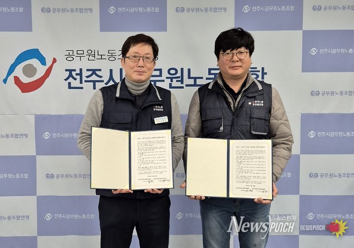 전주시공무원노동조합(위원장 김경오)은 지난달 30일 전주시청 내 노동조합 사무실에서 안동시공무원노동조합(위원장 유철환)과 자매결연 협약식을 가졌다고 밝혔다.