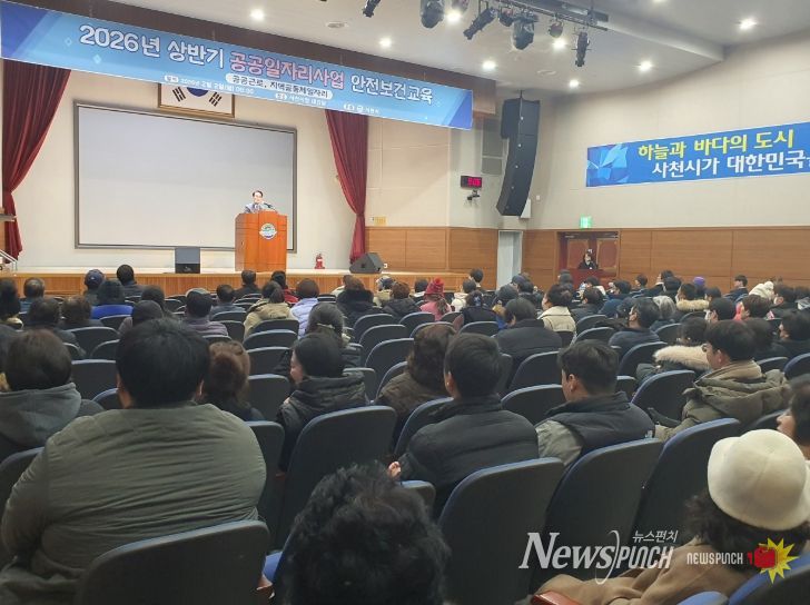 뉴스펀치 박세훈 기자 | 사천시는 2일 시청 대강당에서 상반기 공공근로․지역공동체일자리 참여자와 사업 담당공무원 등 160여 명을 대상으로 2026년 상반기 공공일자리사업 안전보건 교육을 실시했다.