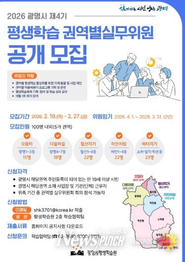 뉴스펀치 박상훈 기자 | 광명시가 시민 주도의 생활권 중심 평생학습 정책을 강화하기 위해 ‘제4기 평생학습 권역별실무위원회’ 신규 위원 100명을 공개 모집한다.