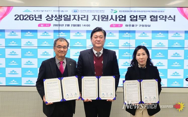 뉴스펀치 정홍균 기자 | 인천 미추홀구는 2일 구청장실에서 인하공업전문대학(총장 김성찬)과 인천미추홀여성인력개발센터(관장 심혜미)와 ‘2026년 상생 일자리 지원 사업’ 추진을 위한 업무협약을 체결했다.