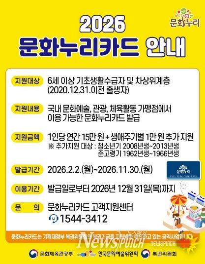 뉴스펀치 김용희 기자 | 광주문화재단(대표이사 직무대행 전은옥)은 2월 2일부터 6세 이상 기초생활수급자 및 차상위계층을 대상으로 2026년 문화누리카드 발급과 사용이 가능하다고 밝혔다.