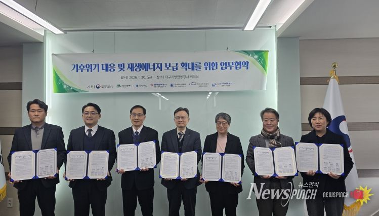 뉴스펀치 박세훈 기자 | 경상북도는 대구지방환경청이 주관하고 대구광역시, 한국에너지공단 대경본부, 한국전력공사 대경건설지사 등 지역 유관기관이 참여하는‘재생에너지 보급 확대를 위한 업무협약’을 2026년 1월 30일 14시, 대구지방환경청 회의실에서 체결했다고 밝혔다.
