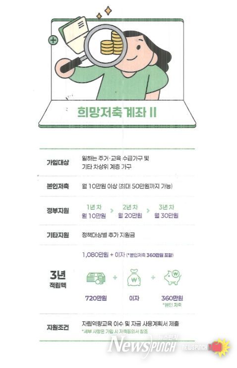 ‘희망저축계좌2’는 근로·사업 소득이 있는 주거·교육 급여 수급 가구 또는 차상위계층이 저축하는 경우, 정부가 일정 금액의 근로소득 장려금을 지원해주는 사업이다.