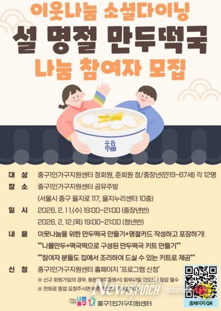 먼저, 소셜다이닝 ‘설 명절 만두떡국 나눔’은 요리 체험과 지역사회 나눔 활동을 연계해 진행된다. 2월 11일과 12일 참여자들이 정성껏 만든 만두떡국 키트와 덕담 카드는 13일 관내 거주 취약 1인가구 20세대에 전달될 예정이다.