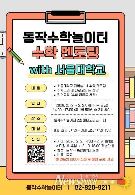 이달 12일부터 27일까지 매주 목요일과 금요일, 동작수학놀이터 2층 피타고라스 카페에서 진행하며, 학생의 학습 수준과 역량을 고려한 1:1 수학 학습지도 및 수학 학습 전략 상담 등 맞춤형 멘토링을 제공할 예정이다.