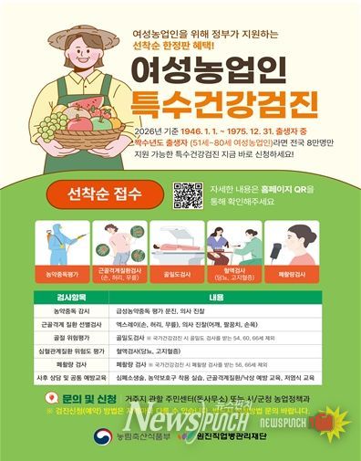전주시 농업기술센터(소장 강세권)는 여성농업인의 안정적인 영농 활동과 삶의 질 향상을 위해 ‘2026년 여성농업인 대상 복지사업’의 대상자를 공개 모집한다고 3일 밝혔다.