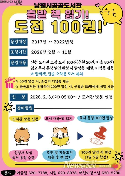 뉴스펀치 정홍균 기자 | 남원시공공도서관에서는 어린이들에게 책 읽기의 즐거움과 독서 습관 형성을 위하여 2월부터 11월까지 ‘출발 책 읽기 도전 100권’ 프로그램을 운영한다.