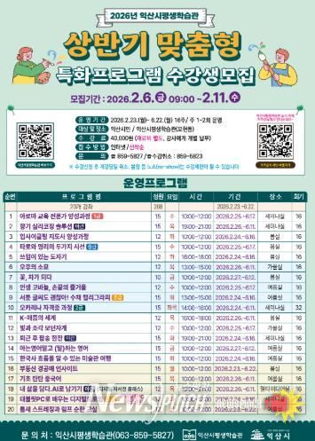 익산시는 오는 6일부터 익산시평생학습관에서 '2026년 상반기 맞춤형 특화프로그램' 수강생을 선착순으로 모집한다고 3일 밝혔다.