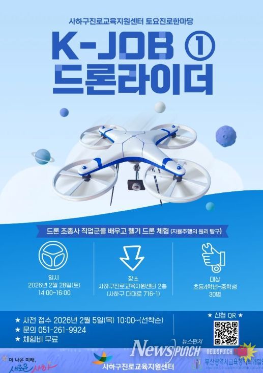 이번 프로그램은 K-JOB 드론 라이더 직업군에 대해 알아보고, 헬기 드론을 활용한 자율주행 원리를 체험·탐구해 보는 시간으로 2월 28일 토요일 오후 2시부터 사하구진로교육지원센터 2층에서 진행된다.
