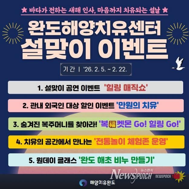 뉴스펀치 김용희 기자 | 완도군은 설 명절을 맞아 귀성객, 군민, 관광객이 그동안 쌓인 피로를 풀고 활력을 얻을 수 있도록 ‘완도해양치유센터, 설맞이 힐링 이벤트’를 2월 5일부터 22일까지 운영한다.