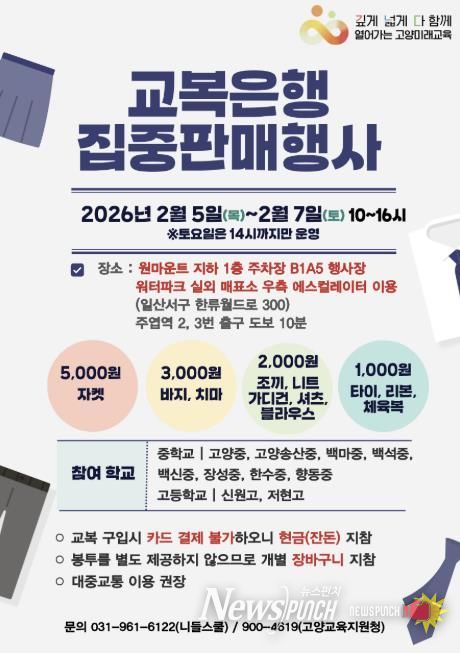 뉴스펀치 박상훈 기자 | 경기도고양교육지원청은 관내 중·고등학교 졸업생의 교복 물려주기 일환으로 교복은행 집중판매 행사를 2월 5일부터 7일까지 3일간 고양 원마운트에서 진행한다고 밝혔다.