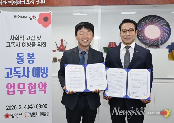 뉴스펀치 최영남 기자 | 남원시는 사회적 고립 및 고독사 예방을 위한 지역 돌봄 체계 강화를 위해 2월 4일 시장실에서 남원시니어클럽(관장 김현성)과 업무협약을 체결했다.