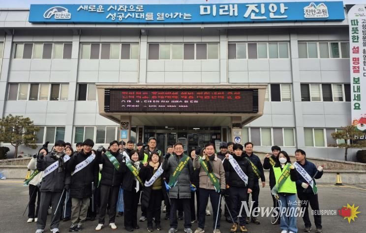 뉴스펀치 최영남 기자 | 진안군은 설 명절을 앞두고 4일, 군청 환경과와 진안읍 행정복지센터 직원 60여 명이 참여한 가운데 진안읍 시가지 일원에서 환경정화활동과 생활쓰레기 저녁시간 배출 캠페인을 추진했다.