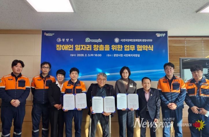 뉴스펀치 김용희 기자 | 광양시는 지난 3일 광양시청에서 ㈜드림피아(대표 이백구)가 사) 한국장애인문화협회 광양시지부(지부장 곽형주)와 함께 장애 예술인(미술) 육성을 통한 장애인 일자리 창출을 위한 업무협약을 체결했다고 밝혔다.