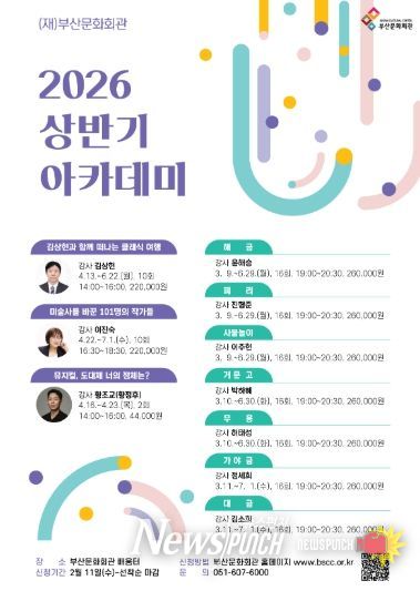 뉴스펀치 김윤걸 기자 | (재)부산문화회관은 오는 3월 9일부터 7월 1일까지 2026년도 상반기 정규 아카데미 강좌를 개설한다.