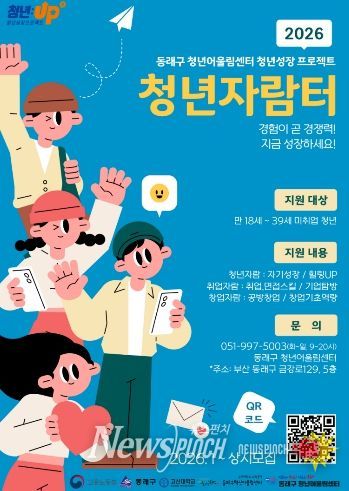 뉴스펀치 김윤걸 기자 | 부산 동래구는 미취업 청년들의 진로 탐색과 취·창업 역량 강화를 지원하기 위해 ‘2026년 청년성장프로젝트 : 청년자람터 1기’ 참여자를 모집한다고 밝혔다.